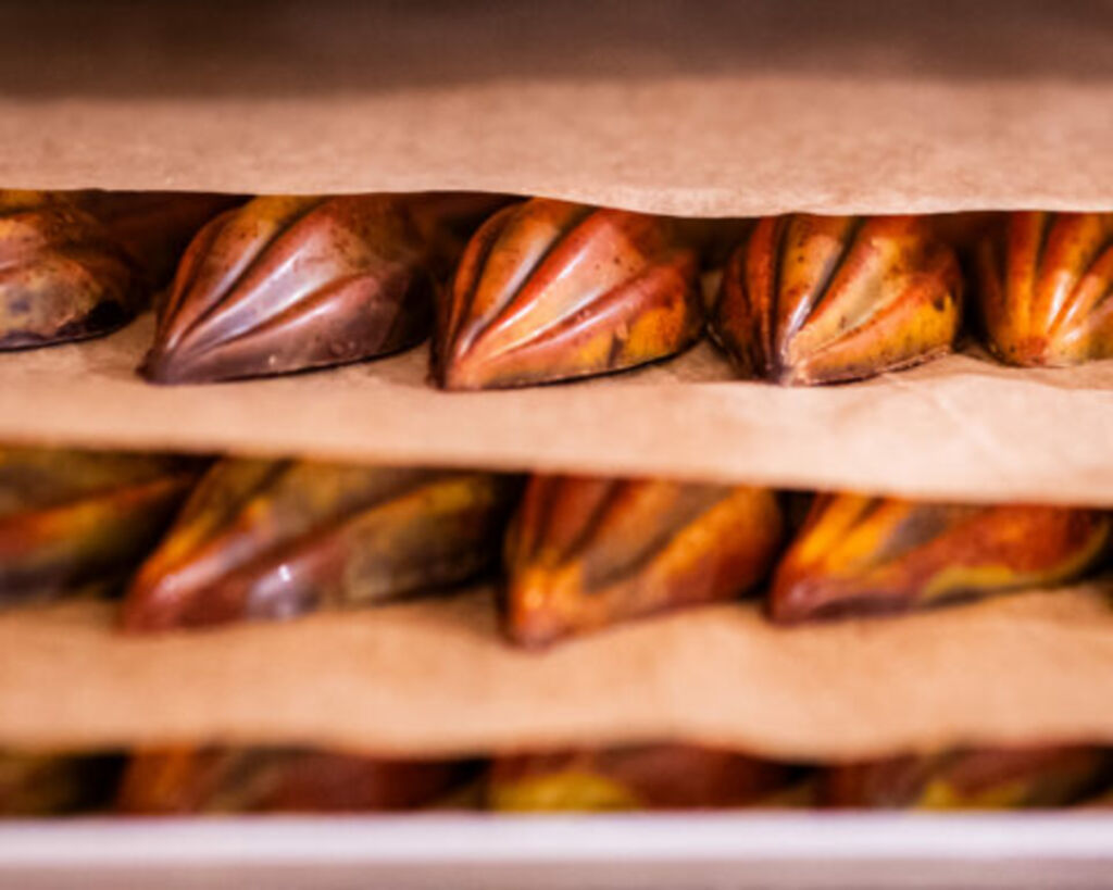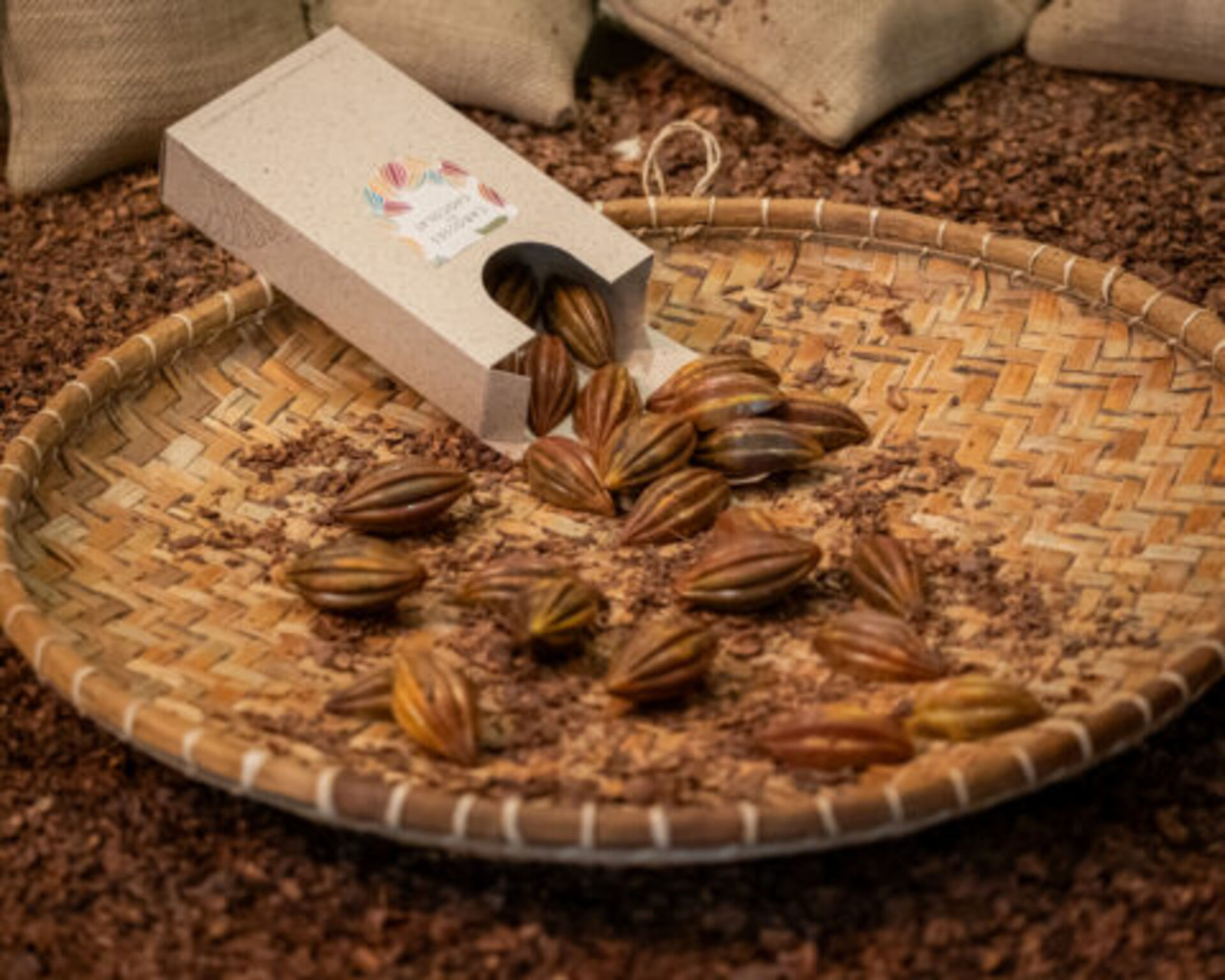 Les mini-cabosses pralinées sont des créations originales inspirées de la forme authentique des cabosses de cacao. Ces bijoux chocolatés révèlent un cœur praliné, pour le chocolat noir 75% aux noisettes torréfiées en version crunchy avec de la feuillantine et pour le chocolat au lait 45% à la pistache. Cette association sublime marie la puissance aromatique du cacao d’origine avec la douceur croquante des fruits à coques, créant un équilibre parfait entre intensité et gourmandise. Leur forme rend hommage en miniature à l’origine même du chocolat dans un clin d’œil poétique aux forêts de cacaoyers.